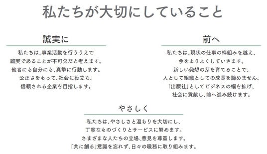 この取り組みを通して、私たちが創立以来、「出版」を通して多くの人の「知るよろこび」(料理、園芸、語学、音楽、教養……)に寄り添ってきたこと。「出版」のかたちが紙・電子・デジタル・音楽と多様になったとしても、今も、そしてこれからも「知るよろこび」に寄り添い続けていくことが私たちの使命であり、目的であるということ。そして、私たちは「誠実に」「やさしく」「前へ」という共通の価値観を大切にしているということを、再確認できました。