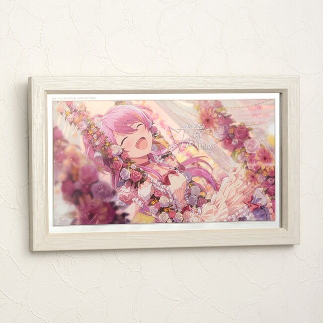 ずっしりとした木枠に収められた美しく輝くガラス製のミラー。ガラス製ミラーの特性に合わせた処理が可能にしたポートレート写真のような奥行きのある立体的な表現。色とりどりの花を背景に、パステルガーリーな衣装を身にまとい笑顔の花開く彼女の魅力に溢れた一枚がここに完成しました。