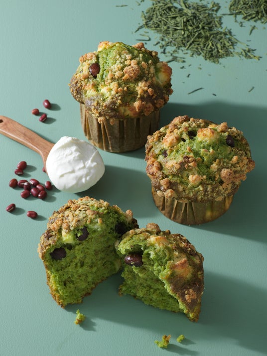 狭山茶ペーストとまろやかなカマンベールチーズを練り込んだマフィンに、エダムチーズクランブル(クッキー)とかのこ豆、チーズをトッピングしました。