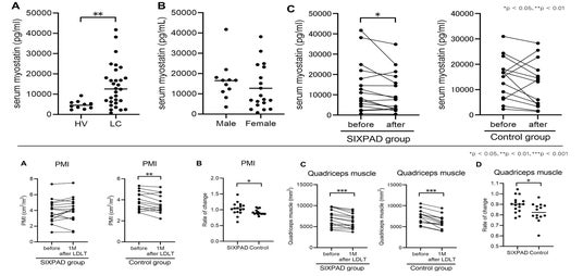 介入群は血清ミオスタチン濃度が有意に改善されました。コントロール群の生体肝移植1ヶ月後の大腰筋指数は介入前よりも低かったにもかかわらず、介入群では維持されました。また、介入群、コントロール群ともに生体肝移植1ヶ月後の大腿四頭筋の面積は介入前より低下しましたが、介入群はコントロール群よりも維持されました。