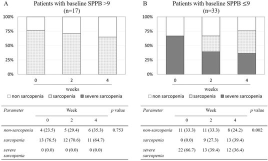 介入前のSPPBスコア9以下だった群(下肢機能低下群)では、EMSを使用した4週間の在宅事故リハビリテーションにより、重度サルコペニアの割合が66.7%から38.4%へと優位に減少しました。