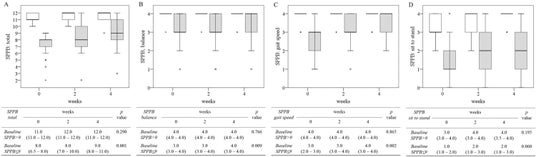 ベースラインSPPB>9グループ(下肢機能正常群)では、合計スコアまたはその構成要素に有意な改善は見られませんでしたが、ベースラインSPPB≤9群(下肢機能低下群)では改善効果が顕著で、合計スコアとバランス能力および歩行速度が有意に改善しました。