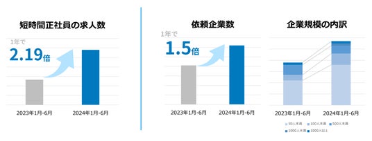 前年同時期と比較したところ、企業から依頼された「短時間正社員」の求人数は2倍に増加、依頼企業数は1.5倍に増加しました。企業規模の内訳としては、従業員数50人未満が過半数を占める構造はサービス開始当初と変わらないものの、従業員数1000人以上の大手企業からの依頼もあり、中小企業のみならず、大手企業も短時間正社員の導入に関心を寄せていることがわかります。