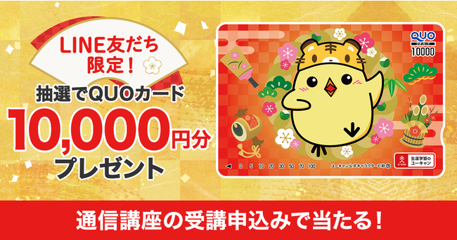 ユーキャンのLINE公式アカウントを友だち追加し、キャンペーンページを経由して通信講座の受講申込みをしていただいた方の中から抽選で5名様に、ユーキャン特製のQUOカード10,000円分を差し上げます。