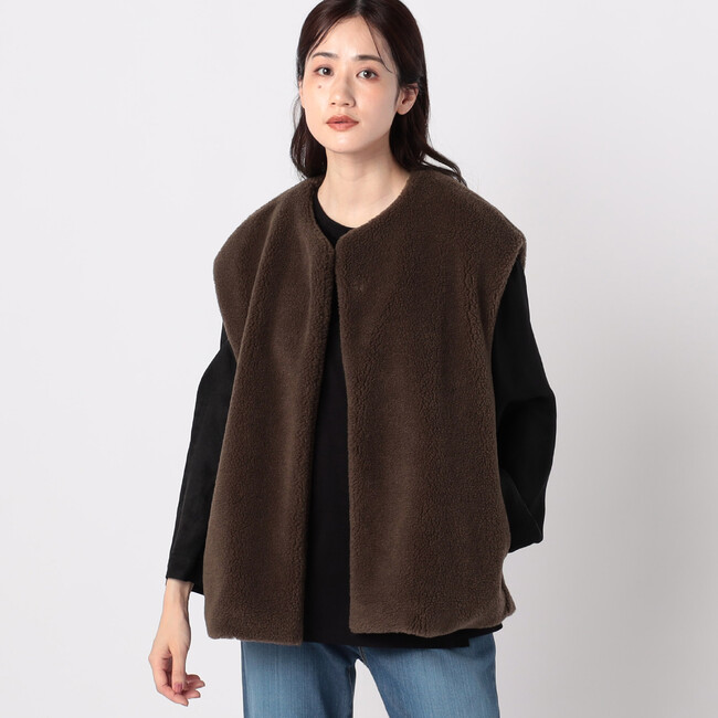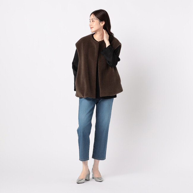 羽織るだけでコーディネートのアクセントになり、一着でぐっと秋の装いになる便利なアイテムをつくりたいと考え、毛足がぎっしり詰まりボリュームのあるエコ素材のボアで、スリーブレスブルゾンをつくりました。