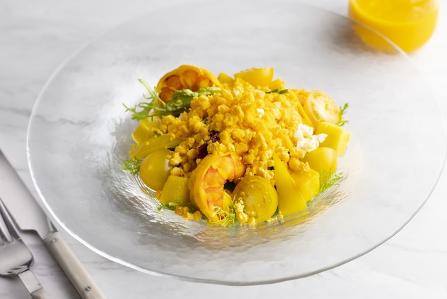 サフランで香り付けした海老やマンゴー、黄色のパプリカやミニトマト