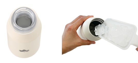 中栓付きの設計で、氷や熱い飲み物が勢いよく飛び出す心配がなく、安心して使用できる。広めの開口部は、家庭用冷蔵庫の氷も入れやすく、お手入れもよりスムーズ。