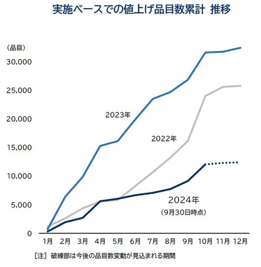 - 2024年通年の値上げは1万3000品目以下、前年の4割程度で推移する見込み