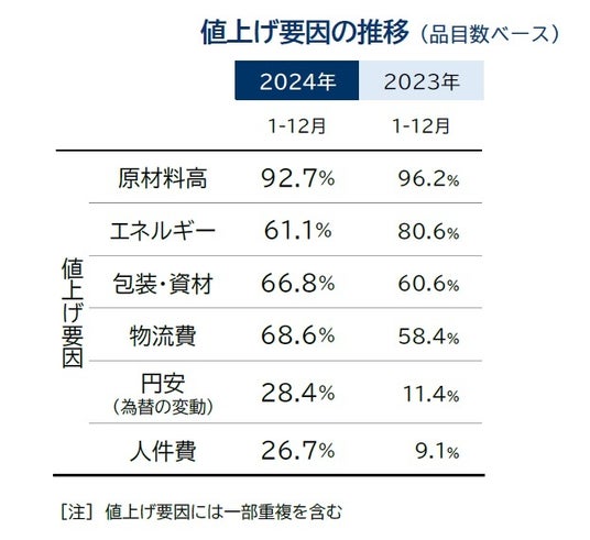 2024年の値上げ要因では、最も多いのが「原材料高」(92.7%)となった。年前半では割合が小さかったものの、チョコレートやコーヒーなど、猛暑や干ばつによる不作を理由に一部原料で価格上昇の影響がみられた。このほか、「物流費」(68.6%)由来の値上げ割合が上昇傾向にあり、24年10月における「物流費」値上げは7割を占めた。「円安」由来の値上げは24年通年で28.4%、「人件費」由来の値上げは26.7%を占め、それぞれ前年を大幅に上回る水準で推移した。