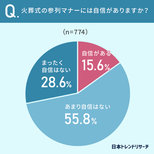 「あまり自信はない」が55.8%、「まったく自信はない」が28.6%、合計で84.4%の方が火葬式の参列マナーに「自信がない」と回答しています。