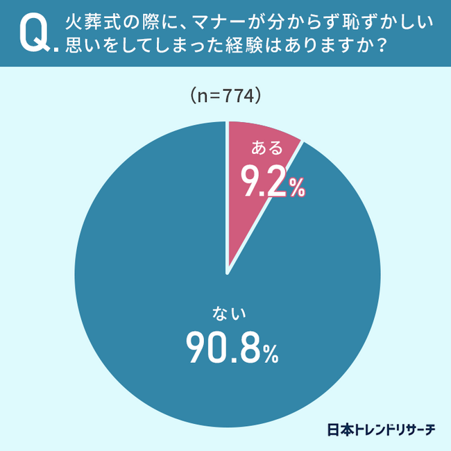 9.2%の方が火葬式の際に、マナーが分からず恥ずかしい思いをしてしまった経験が「ある」と回答しています。