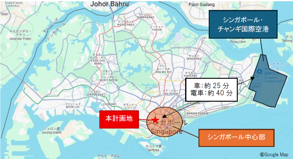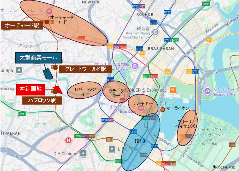 本事業の計画地はシンガポール中心部に位置しており、MRTトムソンイーストコースト線「ハブロック」駅直結という利便性の高い立地です。「ハブロック」駅からは、オフィスが集積するCBDエリアや商業モールが集積するオーチャードエリアへ2~3駅でアクセスでき、将来的にはMRTトムソンイーストコースト線がチャンギ国際空港ターミナル5(2030年代半ば開業予定)直結新駅と既存の空港ターミナル駅(ターミナル2・3直結)まで延伸を予定しています。計画地から徒歩圏であるシンガポール川沿いのロバートソンキー、クラークキーおよびボートキーエリアには、多くの飲食店やオープンスペース、遊歩道が整備されており、複数の新規開発・再開発が進行中で将来的に周辺エリアのさらなる発展が見込まれます。