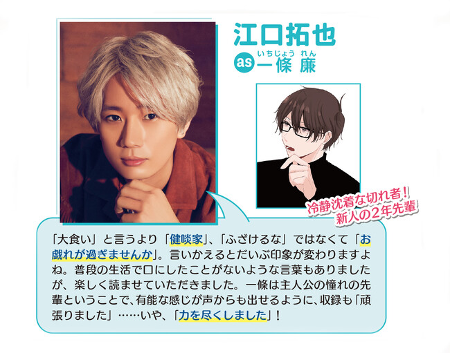 「大食い」というより「健啖家」、「ふざけるな」ではなくて「お戯れが過ぎませんか」。言いかえるとだいぶ印象が変わりますよね。普段の生活で口にしたことがないような言葉もありましたが、楽しく読ませていただきました。一條廉は主人公の憧れの先輩ということで、有能な感じが声からも出せるように、収録も「頑張りました」……いや、「力を尽くしました」。