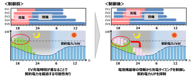*2: 建物の電気使用状況やEVの電池残量等の情報を基に、EVの充電タイミングを制御すること。電力需要ピークの平準化や電気料金の削減が可能。
