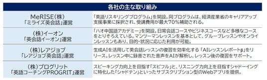 アフターコロナの動きとしては、リスキリング需要に備えた法人向けコースの開設や、オンライン授業への移行などで、かつての「習い事としての語学教室」に当てはまらない多様なスタイルの語学スクールが目立つ。AIによる分析やネイティブ講師との個別レッスン、学習アプリやサブスクリプションサービスとの併用など、新たな付加価値を提供する企業も見受けられる。