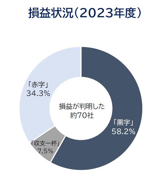 2023年度の損益が判明した約70社を分析すると、「黒字」が58.2%、「赤字」が34.3%、「収支一杯」が7.5%だった。黒字企業では、高スキル人材の定着による顧客増加や、オンライン授業への移行に伴う運営コストの軽減でコロナ禍でも収益を確保した。