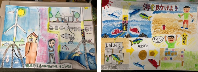 五島の海を守っていくために行われている取り組み、科学技術について、より多くの人に知ってもらう為に、それぞれが考えたキャッチコピーと絵画で表現します。彫刻刀を使った版画や、チラシを使った貼り絵など表現方法もユニークで、描く題材も浮体式洋上風力発電で五島全体が明るくなる絵や、綺麗な海でイキイキ泳いでいる魚を描いている絵など様々です!出来上がったポスターは、しまおうの商品のパッケージに使われる予定です!