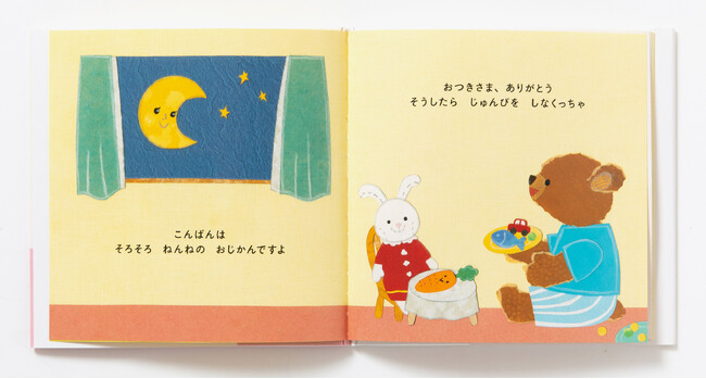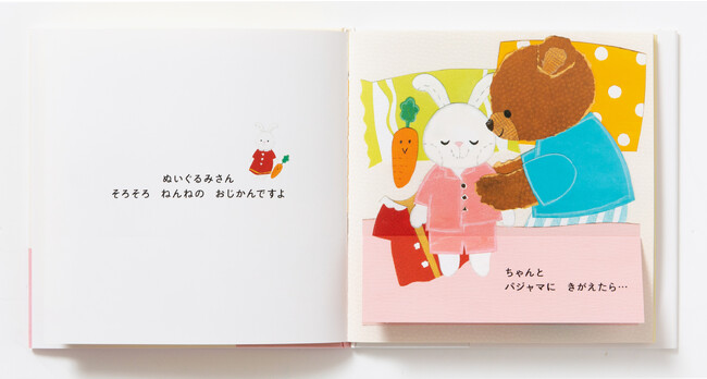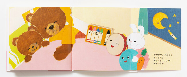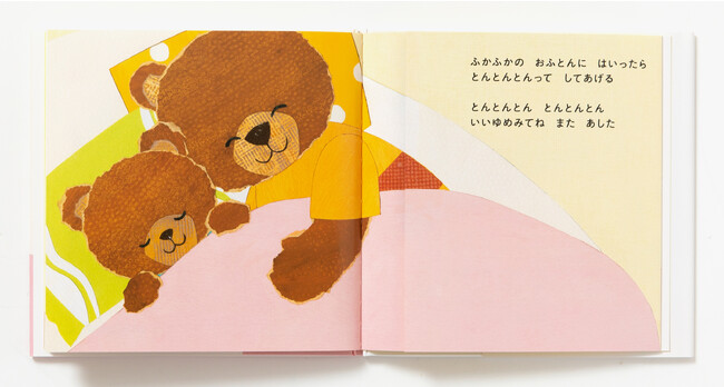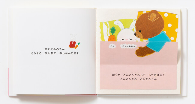 お月さまに「そろそろ寝る時間ですよ」と言われたクマくん。お人形さんやタンバリンなど、自分の大切なおもちゃさん達を「とんとんとん」してあげて、順番に寝かしつけていきます。そして最後には、クマくんが…。「とんとんとん」と優しいリズムが繰り返され、親子がおだやかな気持ちに包まれながら寝かしつけができるしかけ絵本です。