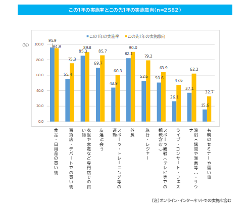 この1年の実施行動の上位は、「食品・日用品の買い物」(95.9%)、「衣服や家電など専門店での買い物」(85.3%)、「外食」(82.1%)となっています。この先1年の実施意向を見るとほとんどの行動でこの1年よりも高くなっています。特に、「旅行・レジャー」「温浴(銭湯や温泉等)・サウナ」「ライブ・コンサート・フェス」ではこの先1年で大きく増加し、「有料のセミナーや習い事」はこの1年の倍以上となりました。