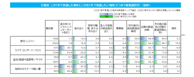この1年とこの先1年の行動場所を見ていくと、「旅行・レジャー」の場所は、この先1年で「その他の国内(近隣の都道府県以外)」「近隣の都道府県」がこの1年よりも高くなっています。「海外」も15%となりました。