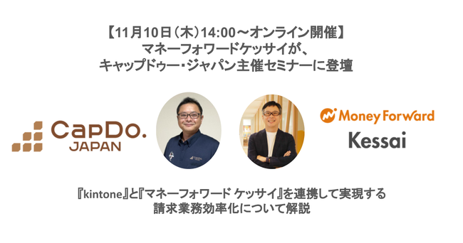マネーフォワードケッサイ株式会社は11月10日(木)14:00からオンラインで開催される、株式会社キャップドゥー・ジャパン主催の「業務に役立つセミナー」に登壇します。本セミナーでは、「電子帳簿保存法」と「インボイス制度(適格請求書等保存方式)」に対応した請求業務の効率化をご紹介します。また、サイボウズ株式会社の業務改善プラットフォーム『kintone』をご利用中・ご検討中の方向けに、『kintone』と企業間後払い決済サービス『マネーフォワード ケッサイ』の連携についてもご紹介いたします。