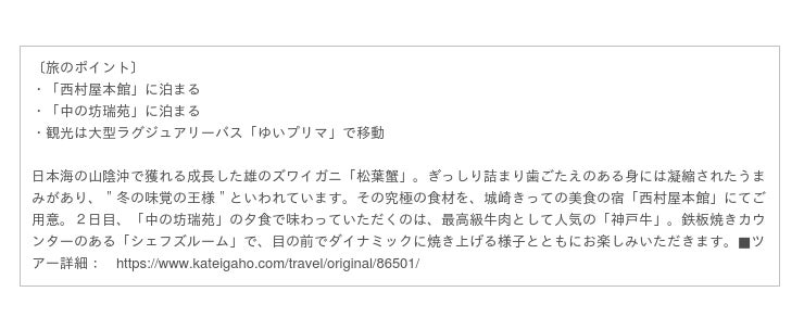 「西村屋本館」「中の坊瑞苑」に泊まる 松葉蟹のフルコースと神戸牛を堪能 城崎温泉・有馬温泉2つの名湯で美食を愉しむ3日間(一人当たり 39万8,000円~53万8,000円)