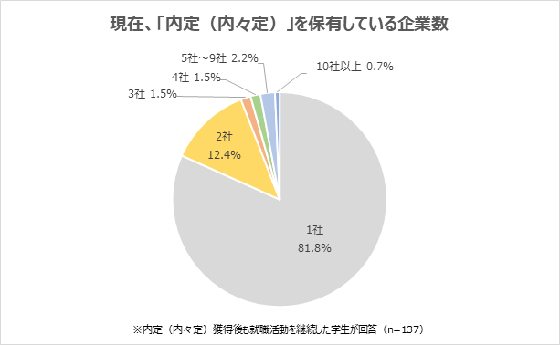 現在「内定(内々定)」を保有している社数(既に辞退した社数は含まない)について、「1社」と回答した学生は81.8%でした。「2社」12.4%をはじめ、約2割の学生は現在も2社以上の内定(内々定)を保有していることが明らかになりました。
