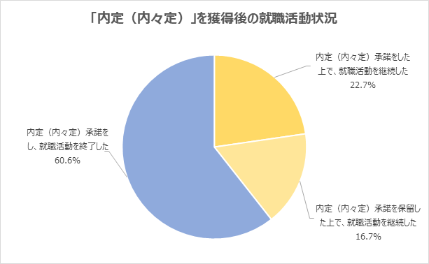 「内定(内々定)」獲得後の就職活動について、「内定(内々定)承諾をし、就職活動を終了した」と回答した学生は、60.6%でした。「内定(内々定)承諾をした上で、就職活動を継続した」22.7%、「内定(内々定)承諾を保留した上で、就職活動を継続した」16.7%となっており、約4割は内定(内々定)獲得後も就職活動を継続していたことが分かります。
