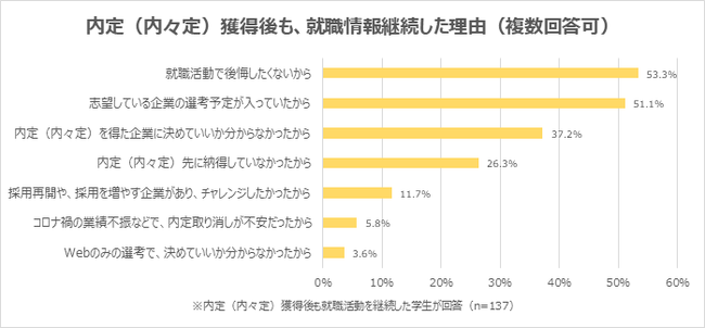 内定(内々定)獲得後も就職活動を継続した理由は、「就職活動で後悔したくないから」が53.3%で最多。次いで、「志望している企業の選考予定が入っていたから」51.1%、「内定(内々定)を得た企業に決めていいか分からなかったから」37.2%が続きました。就職活動を納得して終えたい、選考中の企業は最後まで受けたいという意向がうかがえます。また、「採用再開や、採用を増やす企業があり、チャレンジしたかったから」が11.7%となっており、アフターコロナを見据えて新卒採用を再開・強化する企業の動きを受け、就職活動を継続した学生も一定数いたことが分かります。