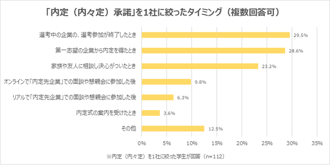 「内定(内々定)承諾」を1社に絞ったタイミングは、「選考中の企業の、選考参加が終了したとき」が29.5%で最多。次いで、「第一志望の企業から内定を得たとき」28.6%、「家族や友人に相談し決心がついたとき」23.2%が続きました。フリーコメントでは、「OB・OGと面談する機会をつくってもらい、企業理解をより深めることができたタイミングで承諾を決めた」「家族や友人、キャリアセンターの方に相談し、自身の気持ちや考えを整理できたタイミングで承諾した」「内定者と交流し、入社後のイメージを持てたときに決めた」「辞退を先延ばしにすると企業に迷惑がかかるので、8月末までには決めようと思っていた」といった声が上がりました。