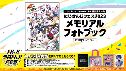 にじさんじオフィシャルストアにて下記対象商品を購入すると、特典としてにじフェス2023全体の写真を盛りだくさんに詰め込んだ「にじさんじフェス2023 メモリアルフォトブック」がもらえる連動購入特典セットの発売が決定!