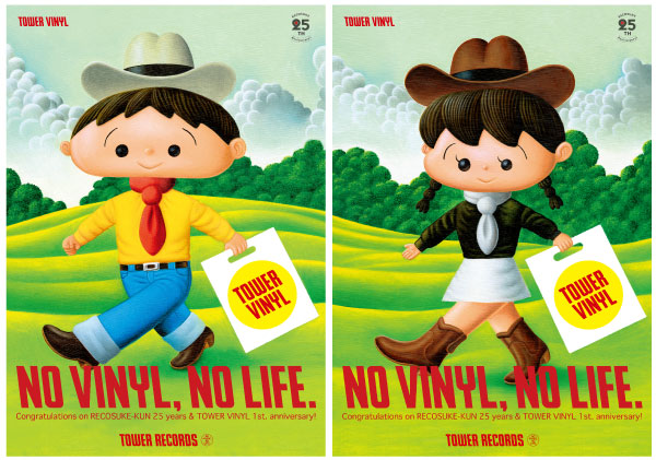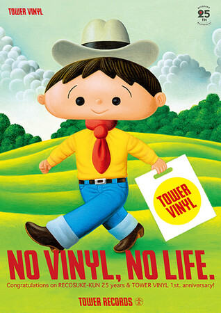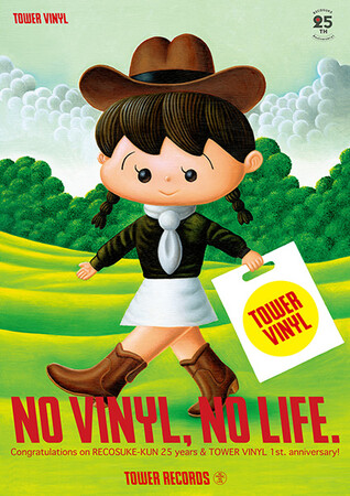 今年の春からスタートした誕生25周年のレコスケくんとのコラボレーションでは、コラボステッカーを配布するなどの施策を実施してきました。今回の周年キャンペーンでは、新しく油絵で描き下ろされた奥行きたっぷりのレコスケくんとレコガール2種のヴィジュアルが登場。この「NO VINYL, NO LIFE.」ポスターは、タワーヴァイナル渋谷限定で掲示します。