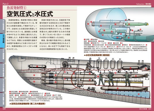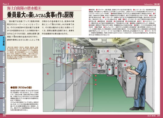 そして何より、折込を含めて全422ページというボリュームも本書の売りのひとつ。兵器そのものだけでなく、食堂やキッチン、トイレ、居住スペースの様子がわかるイラストも多数掲載、搭乗員たちの日々の生活についても詳しく図解されています。