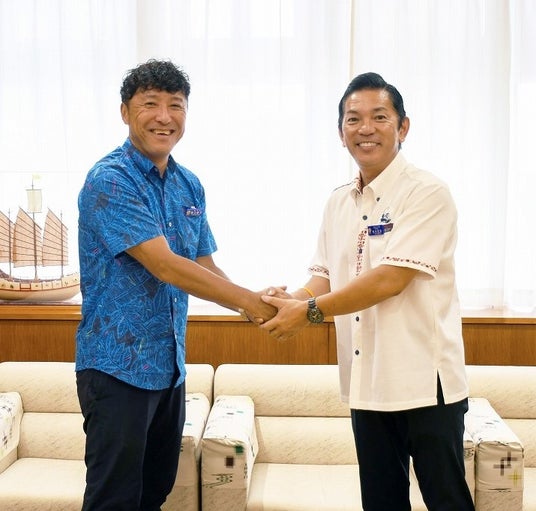 地域活性化起業人のアデコ株式会社 亀谷 貴史と浦添市長 松本 哲治氏(右)