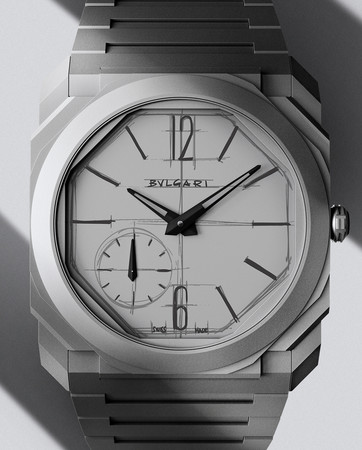 「オクト フィニッシモ」コレクションの美学を体現するケース、ダイヤル、ブレスレットは超軽量チタン製で、モダンな外観と比類ないエレガンスを体現しています。イタリア建築の傑作からインスピレーションを得た力強く大胆なケースのラインがブルガリのルーツであるローマを表現し、ファセットが放つ光彩が人を惹きつけます。サンドブラスト仕上げのチタンと、コントラストを成す、PVD加工を施したブラックの針、インデックス、ブルガリのロゴ、そしてファブリツィオ・ボナマッサ・スティリアーニが描いた初期のスケッチを再現した、スモールセコンドカウンターの刻印が施されたモデルです。その長けた視認性とオリジナルのスタイルを両立させた仕上がりになっています。セラミック製リューズを備えた直径40mmのつややかなケースと、しなやかなリンクが繫がる滑らかな一体型ブレスレットが軽やかでしっくりと手首に馴染みます。