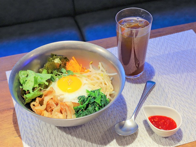 1ボウルでもしっかり栄養の取れるたっぷりの野菜と、サムギョプサル(豚バラ肉)が乗った、韓国人シェフ特製のビビンパ。