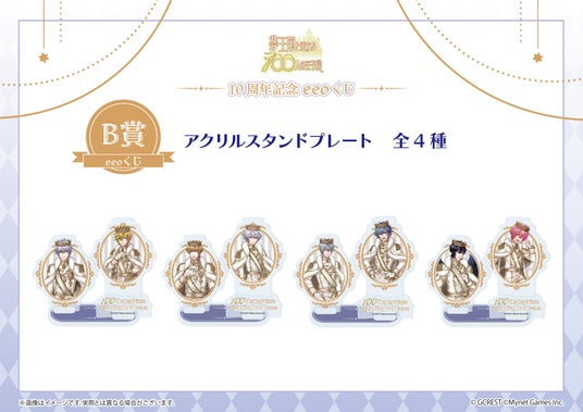 「eeoくじ」には、「10周年Ver.王子様」の公式ビジュアルを使用した景品がラインナップ! アルマリ、グレイシア、シュニー、トトリ、トニ、ドライ、ヒナタ、ルシアンが豪華な衣装を身にまとって登場しました。