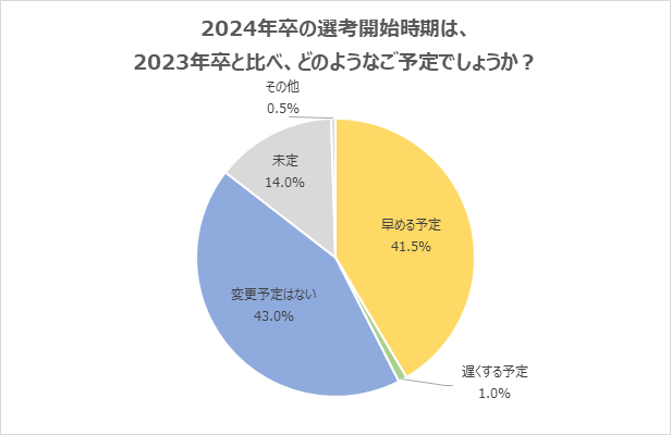2024年卒の選考開始時期について、「早める予定」と回答した企業が41.5%に上りました。4割以上の企業が、2023年卒採用より「早める」としており、「早期化」の傾向はより強くなると想定されます。選考を開始する時期は「2023年2月頃」が21.8%で最多。次いで「2023年1月頃」20.6%が続きました。広報解禁となる3月を待たずに、選考を開始する予定の企業が62.4%に達しています。