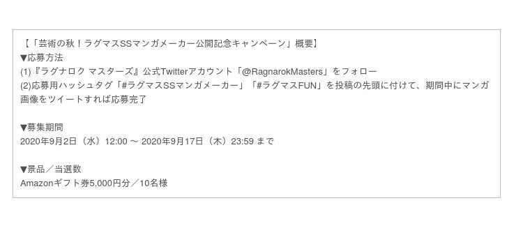 期間中、「ラグマスSSマンガメーカー」でマンガ風の画像にしたSSを応募用ハッシュタグ「#ラグマスSSマンガメーカー」「#ラグマスFUN」をつけて、Twitterでツイートしていただいた方の中から抽選で10名様にAmazonギフト券5,000円分をプレゼントいたします。