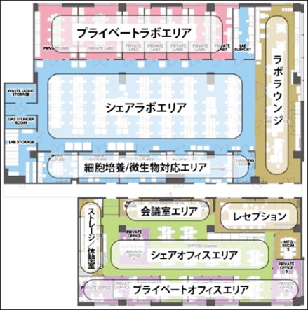 【ウェットラボ区画】 ベンチ:66席(予定)、個室ラボ、細胞培養室等