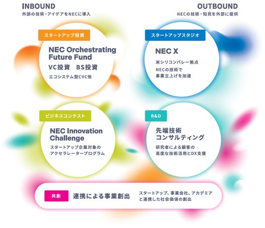 NECは今年2月、新たなオープンイノベーション体系「NEC Open Innovation」を発表し、外部の技術やアイデアを自社に導入する「インバウンド型」、自社の知見・技術を外部に提供し事業化を加速する「アウトバンド型」の2つのモデルでオープンイノベーションを推進しています。