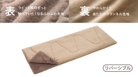ずっと触っていたくなるようなラビットファーのような毛足の長いふわふわ生地と、肌触りのよい柔らかなフランネル生地とのリバーシブル構造なので、お好みの生地を肌面にして使用できます。