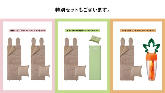 超早割や2個セットのほか、キャンプの夜には欠かせないインフレートマットとまくらのセット、シュラフと相性抜群な「キャロットランタン」セットなど、お得にお求めいただける特別セットも数量限定でご用意しております。詳しくはMakuakeページよりご確認ください。
