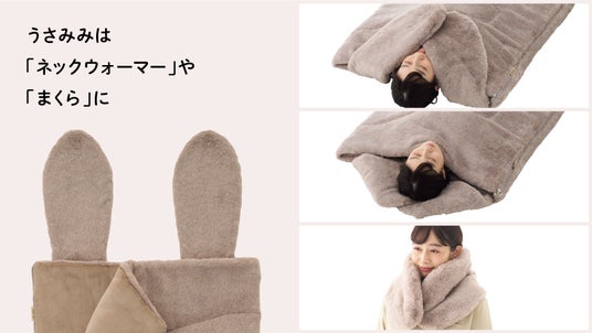 うさみみ部分は首周りの冷気を防ぐネックウォーマーやまくらとしても活躍。スナップボタンで連結や取り外しができるため、ネックウォーマーとして普段使いも可能。