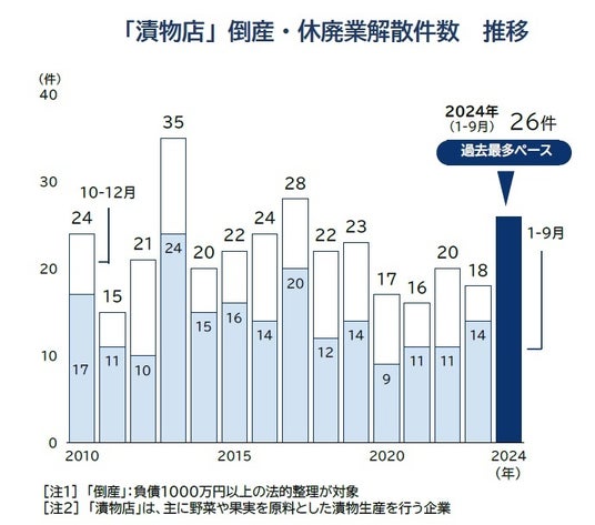 昔ながらの「故郷の味」を代表する漬物店の倒産や廃業が増加している。食品スーパーや道の駅などの小売店向けに、野菜類を原料とした漬物を生産・販売する「漬物店」の倒産(負債1000万円以上、法的整理)が8件、休廃業・解散(廃業)が18件発生し、計26件が市場から消滅した。23年通年の件数(18件)を既に上回って推移しており、年間で過去最多となる可能性がある。
