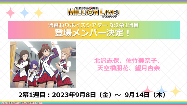株式会社バンダイナムコエンターテインメントは、アニメ「アイドルマスター ミリオンライブ!」の劇場先行上映第2幕のあらすじを公開、第2幕1週目の来場者特典&週替わりボイスシアターの登場メンバーも公開いたしました。
