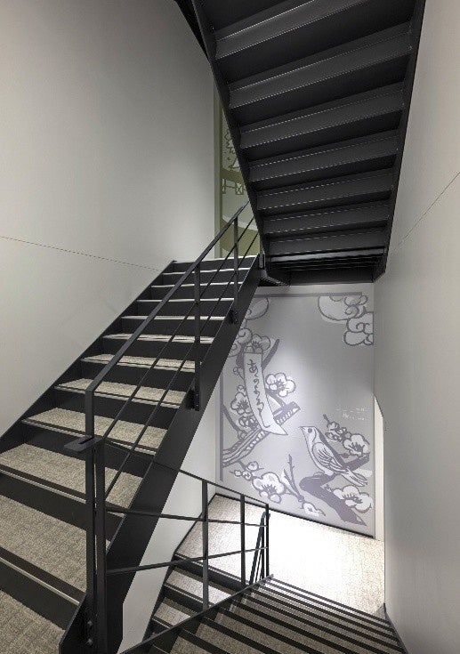 また、本物件のオフィスワーカーの健康意欲の向上を目的として、屋内階段の利用を促進する工夫を凝らしています。エントランスからすぐわかる位置に屋内階段を配置し、各階の階段踊り場には階数と花暦を連動させた壁面アートを施すことで、自然と階段を利用したくなる工夫をしました。
