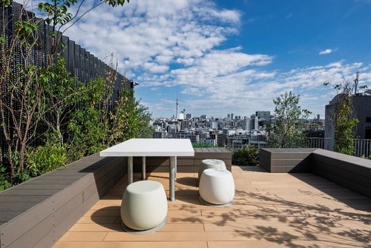 スカイツリーを望む地上約50メートルの屋上には、屋上庭園を整備します。高中木や低木地被類の複層的な植栽配置により緑豊かな空間を実現し、仕事の合間の息抜きやランチタイムにおけるリフレッシュなど、オフィスワーカーが快適に過ごせる場を創出します。