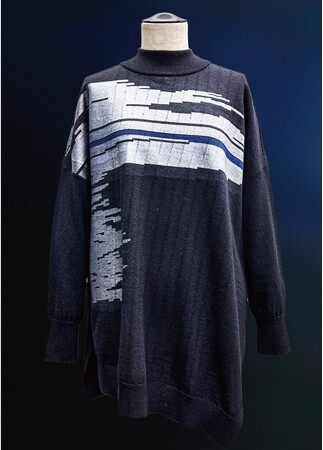 ・襟はハイネック、左脇にはスリットを入れ、身頃は斜めに編み立てたアシンメトリーなシルエットです。