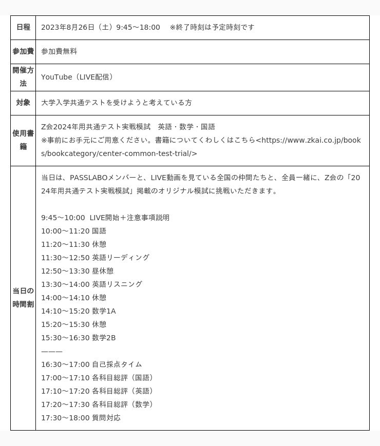 株式会社増進会ホールディングス(Z会グループ)のグループ会社、株式会社Z会ソリューションズは、株式会社ペイ・フォワードが運用するYouTubeチャンネル「PASSLABO」と協力して、全国共通テスト模試を実施。YouTubeLIVE動画にて、2023年8月26日に行います。